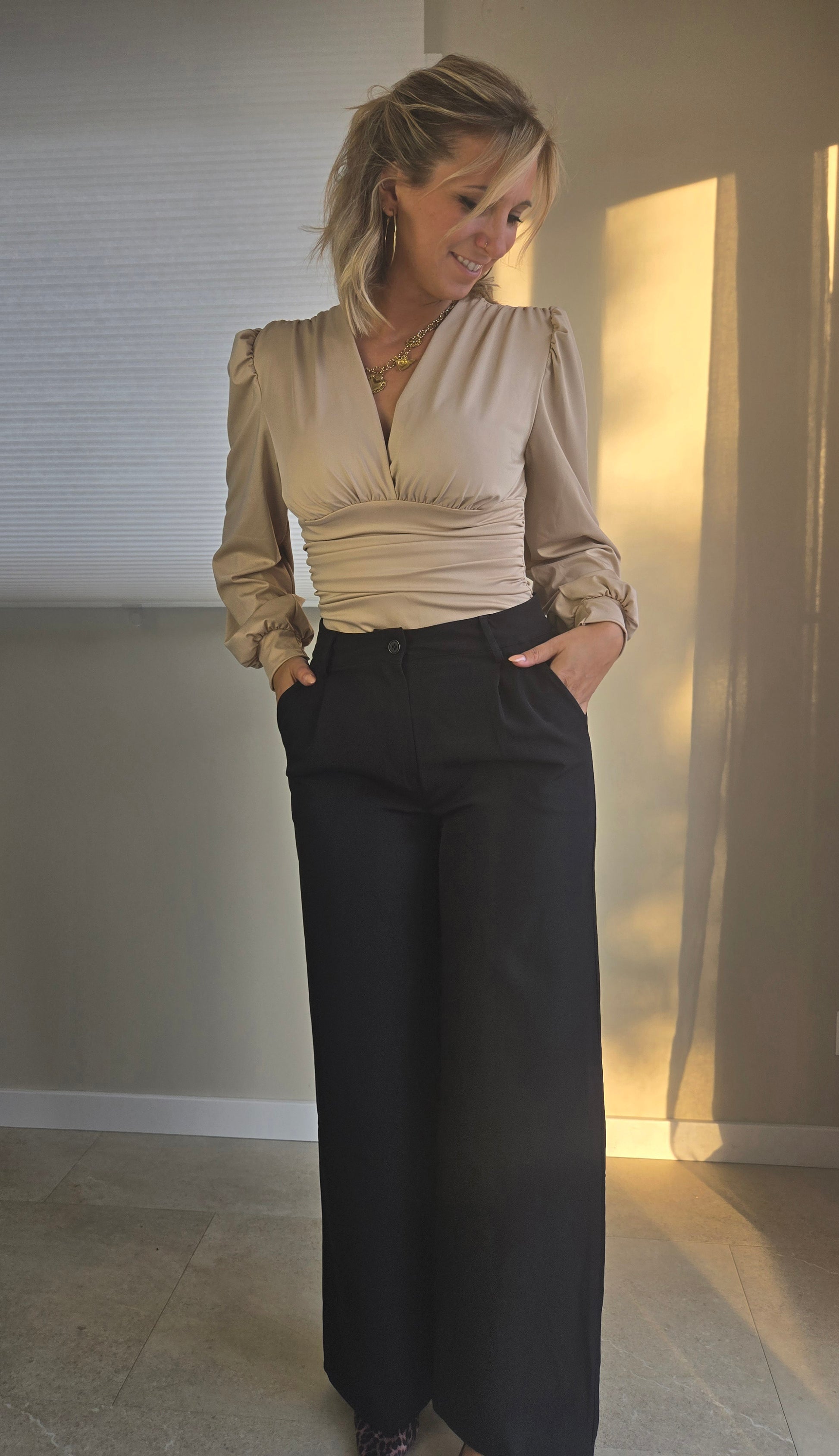 Body ALBA, top à manches longues et bouffantes, disponible en rose ou beige.