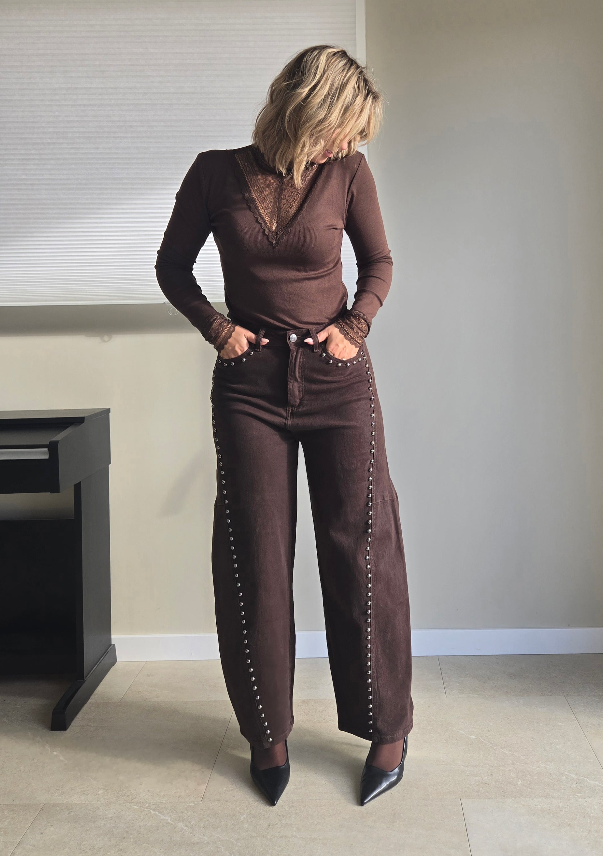 BARREL : Le jean marron intense et détails cloutés le long des jambes pour une présence incontournable. Ce jean barrel repousse les limites du classique avec son allure rebelle et sa coupe ample qui affirme sans compromis.