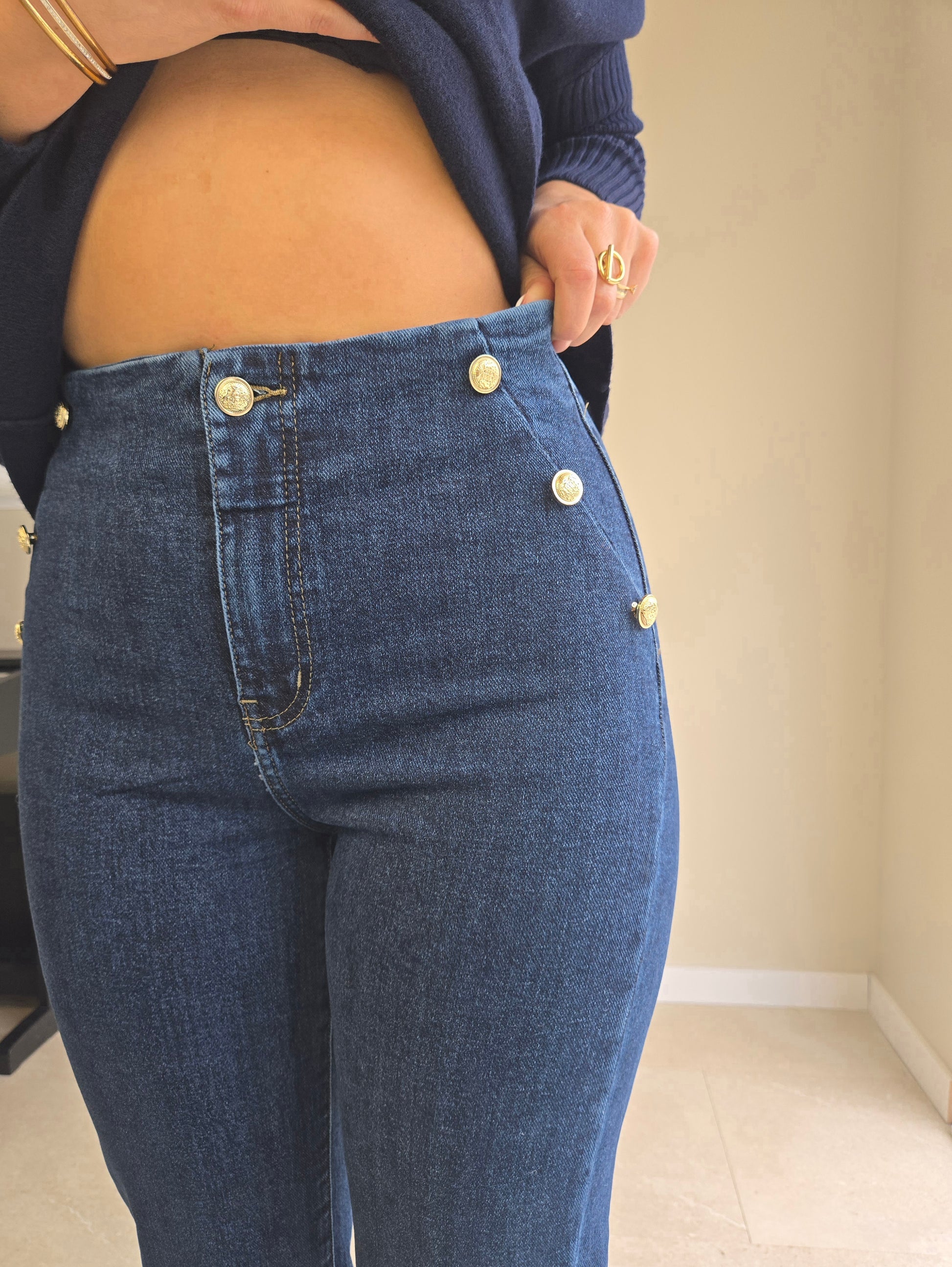 Jean coupe flared en denim brut LYDIA – avec boutons dorés pour une silhouette audacieuse qui épouse les courbes avec assurance.