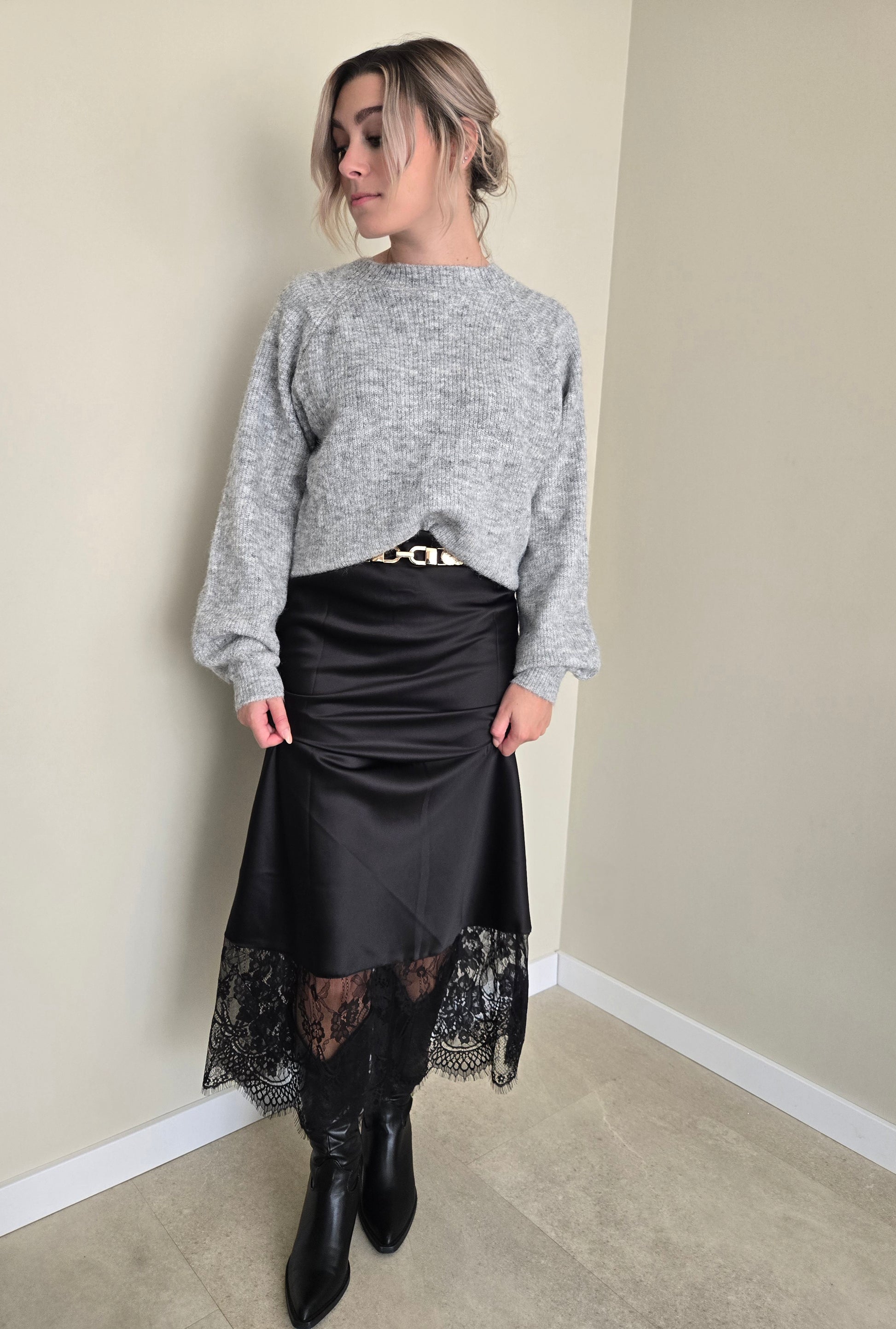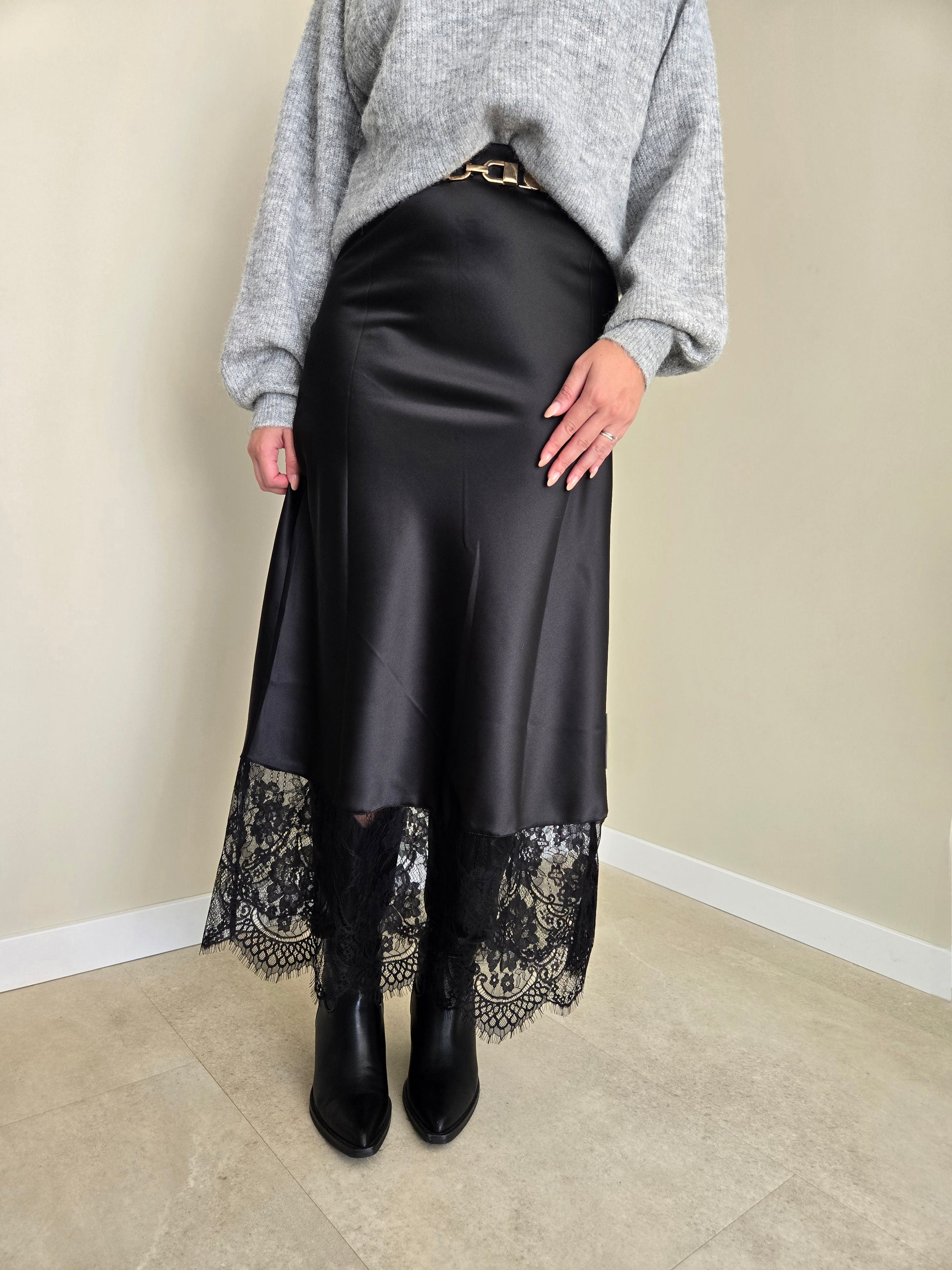 La jupe longue AVA allie satin fluide et dentelle délicate pour un look élégant. Sa coupe souligne la silhouette avec sensualité, parfaite pour une allure captivante et pleine de caractère. Osez la sophistication avec cette pièce unique.