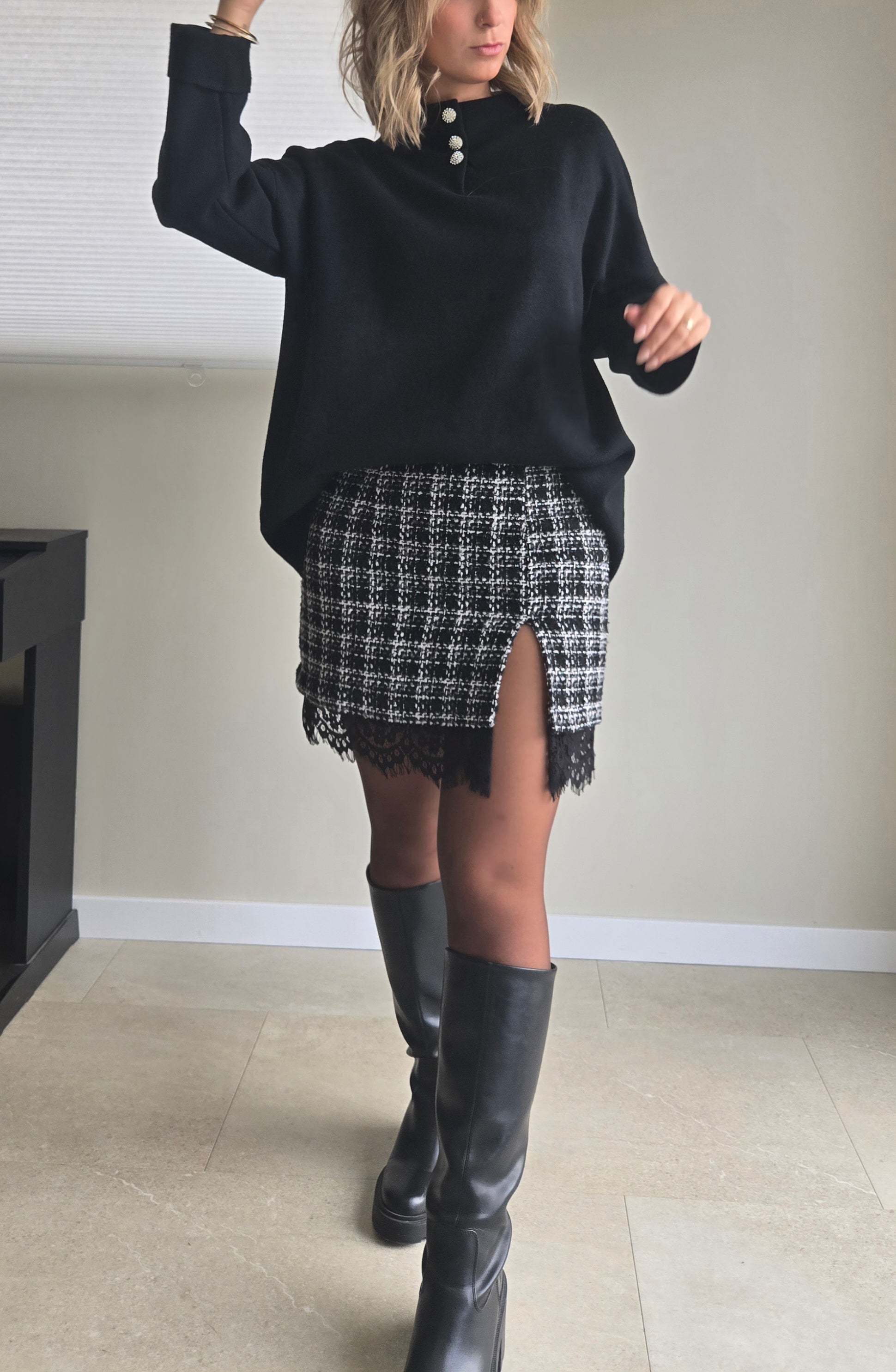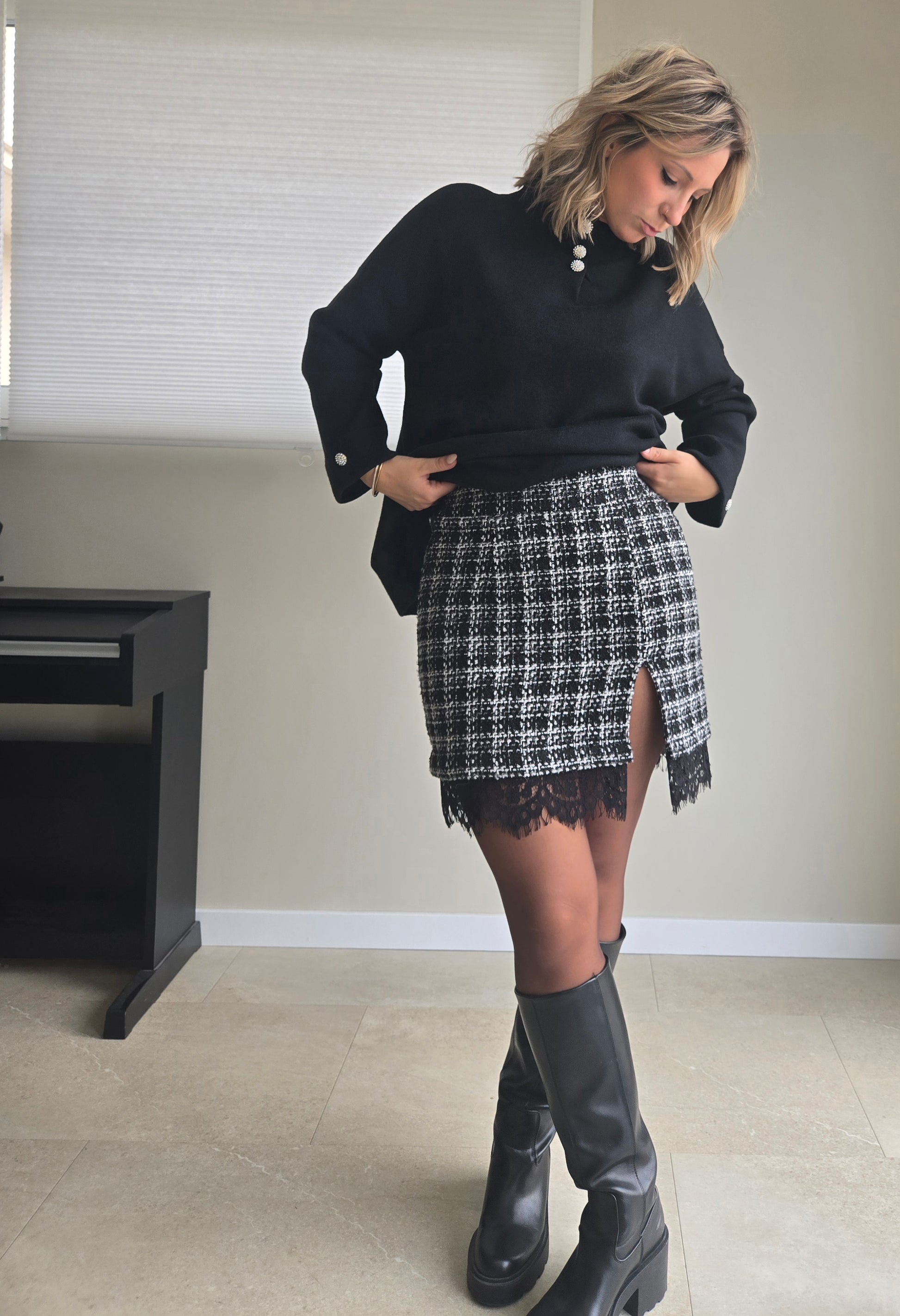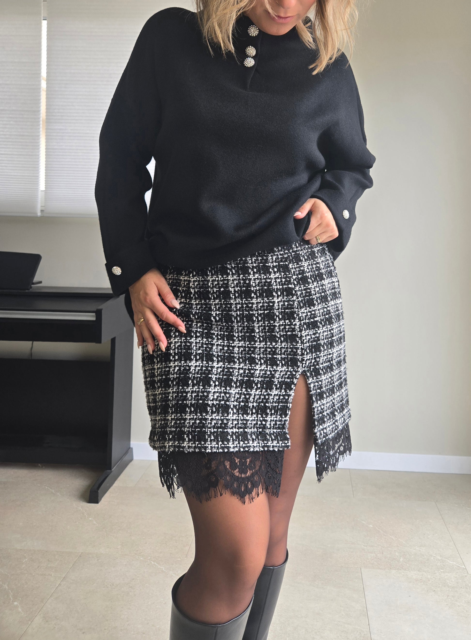 Jupe à carreaux et dentelle LEYA. Une jupe italienne audacieuse qui allie texture classique et finition délicate pour un style intemporel et sophistiqué.