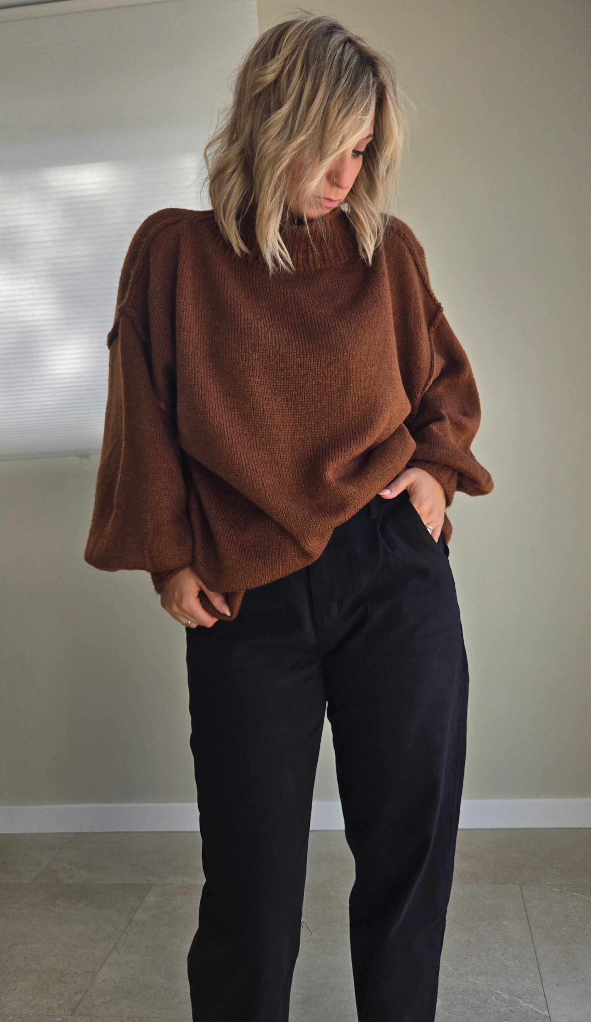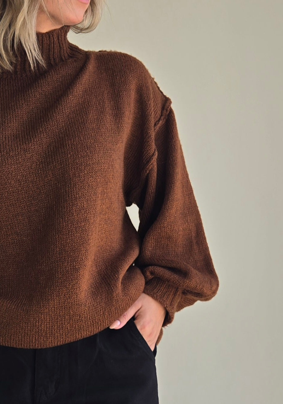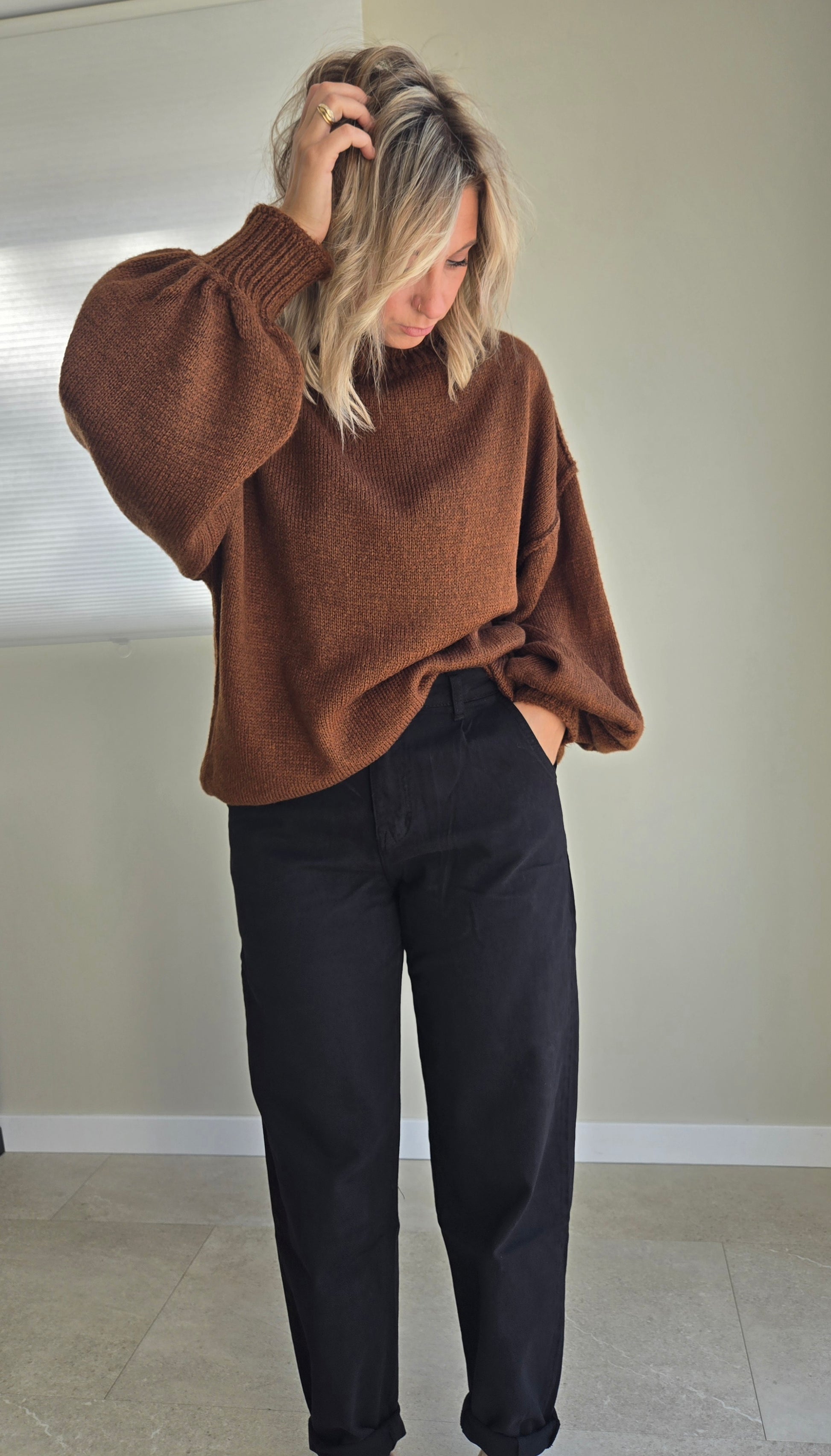 Le pull MAELYA, oversize marron à col montant offre une douceur et un confort parfaits pour affronter l’automne avec style.
