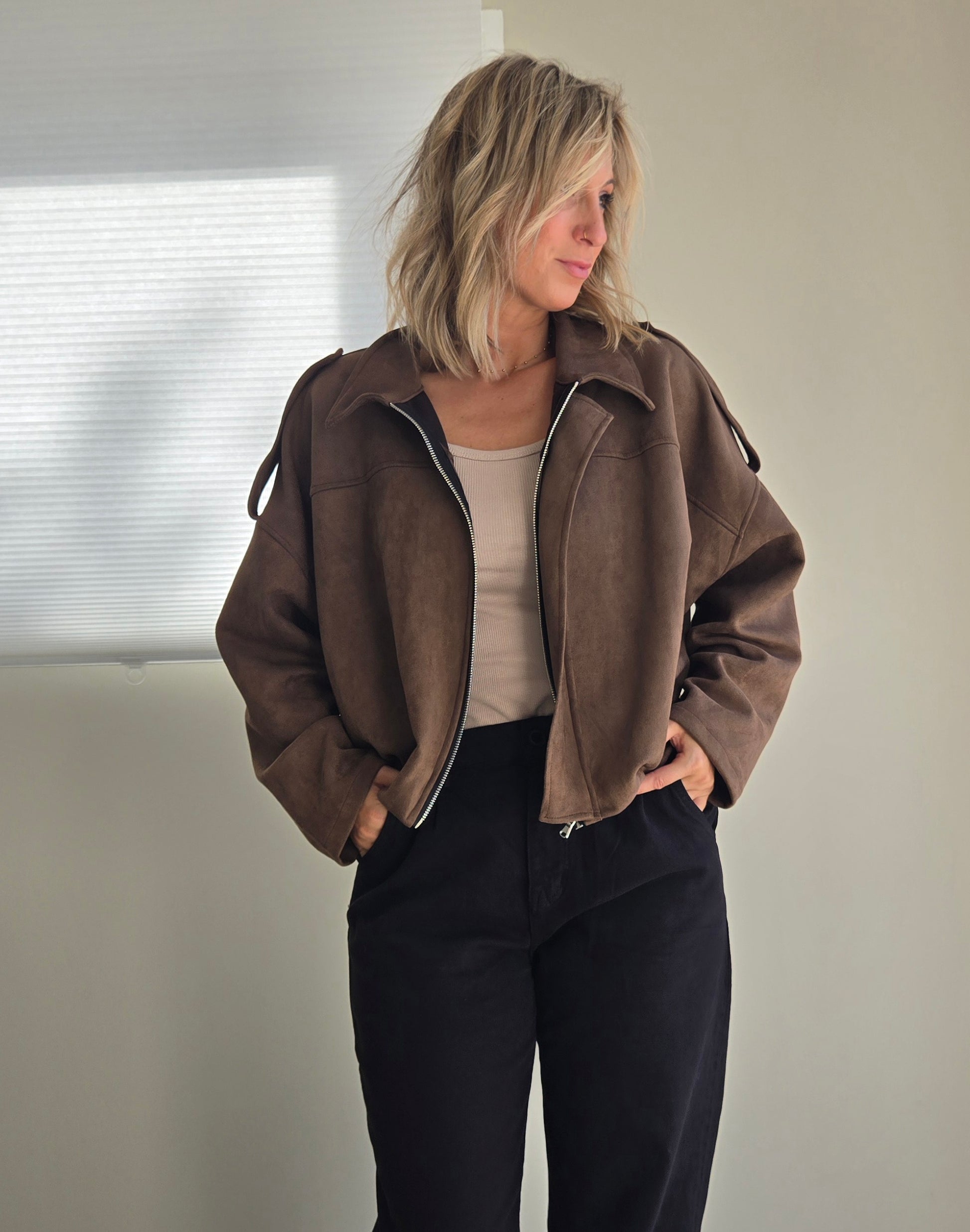 La veste EMY oversize en daim marron, le must-have que toutes les femmes veulent absolument cet automne.