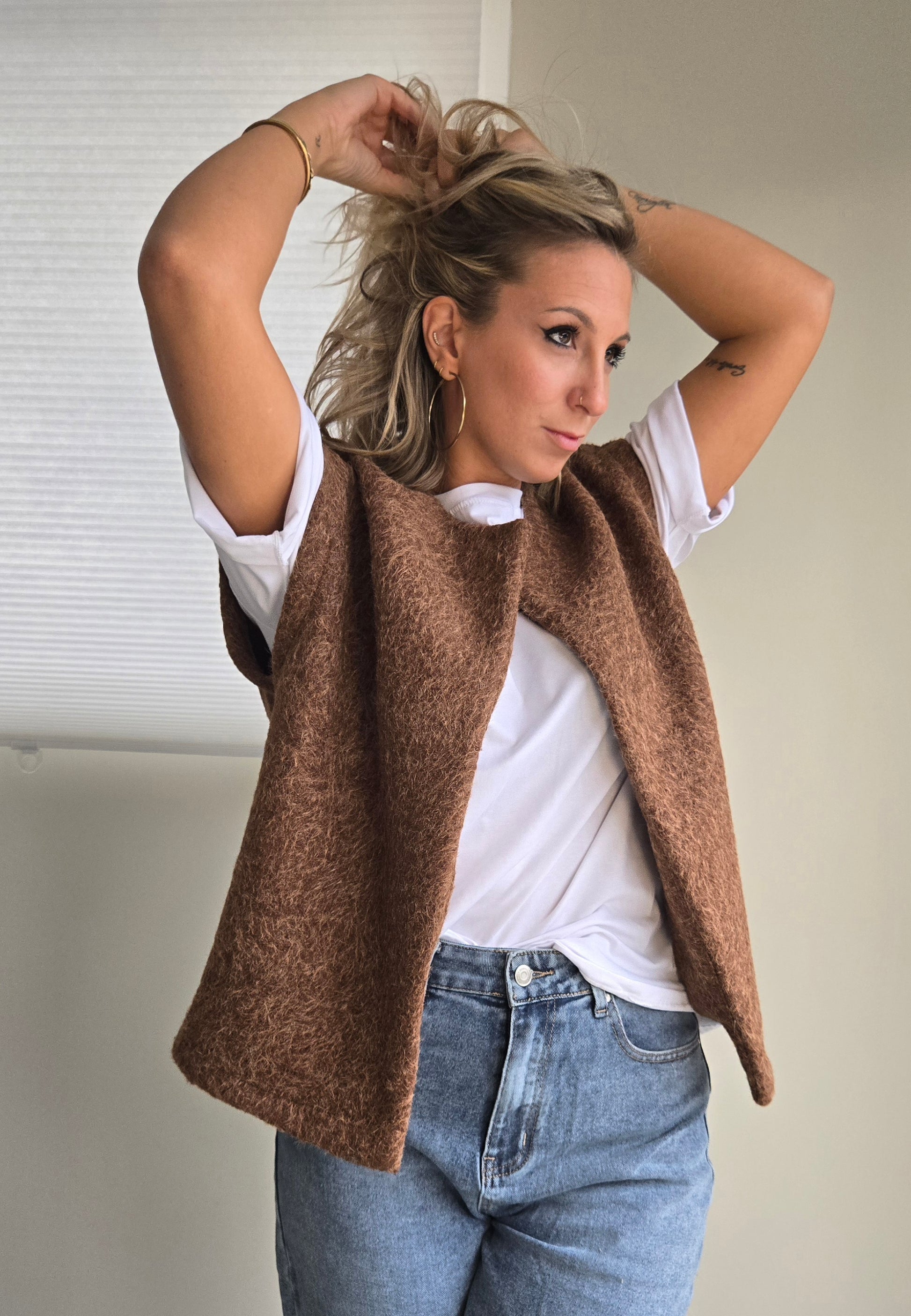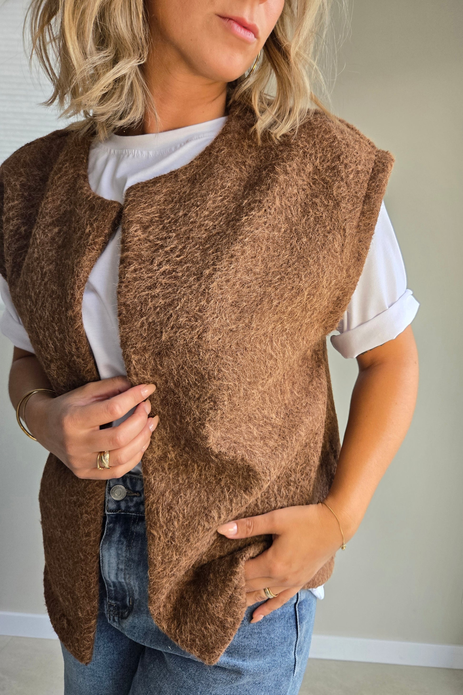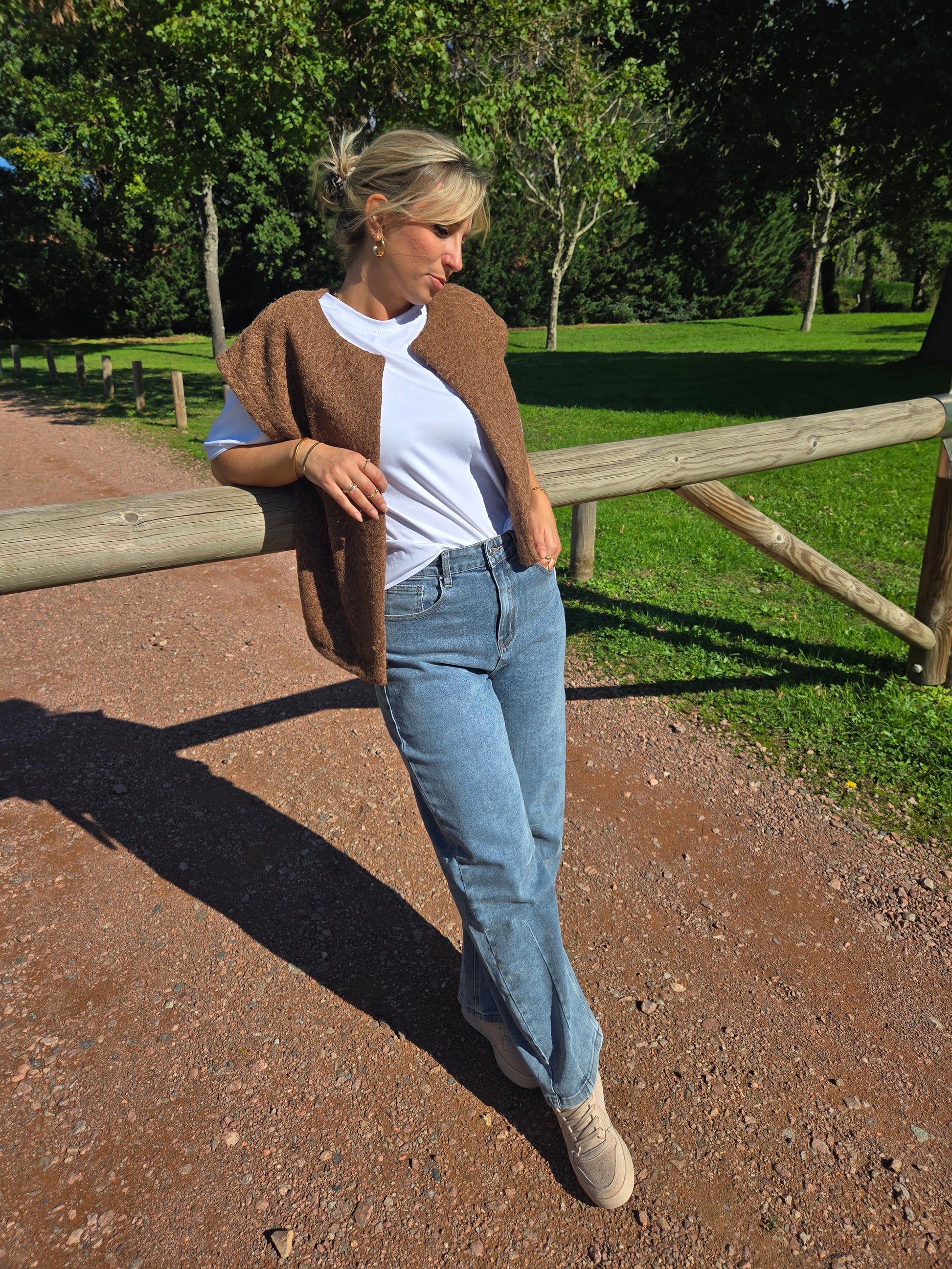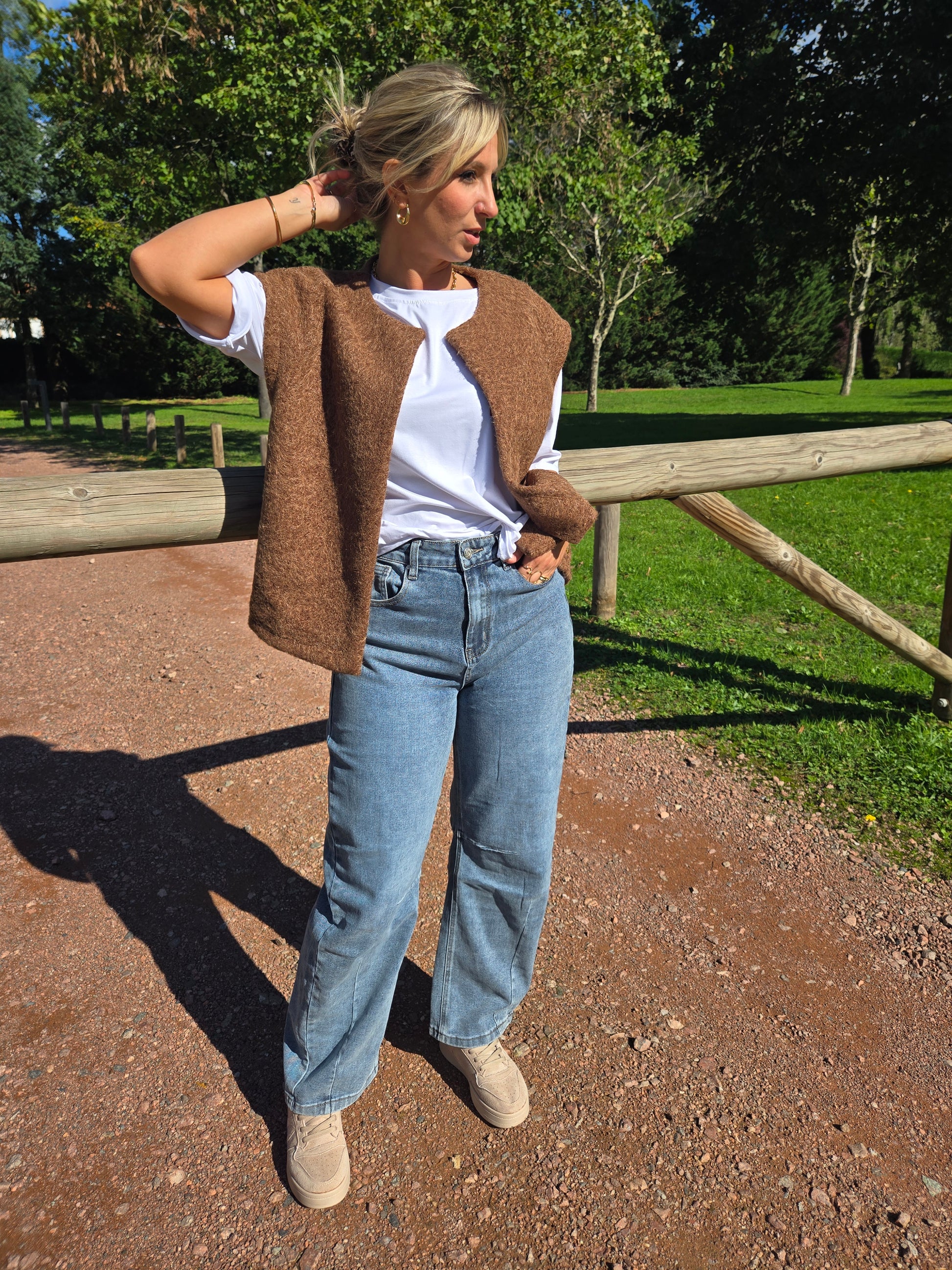 Cette veste sans manches en feutrine marron signée KENZO allie élégance et confort pour un style unique et affirmé.